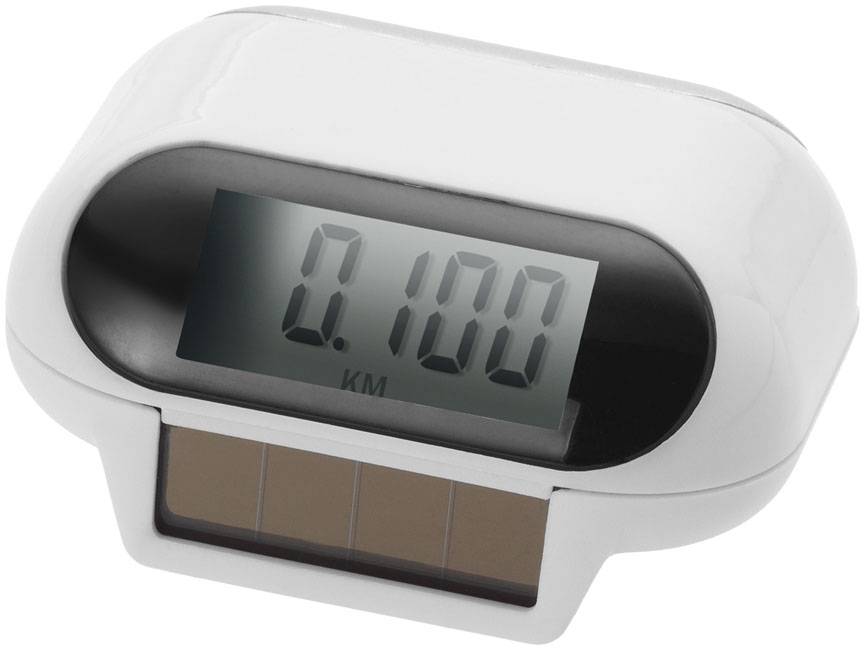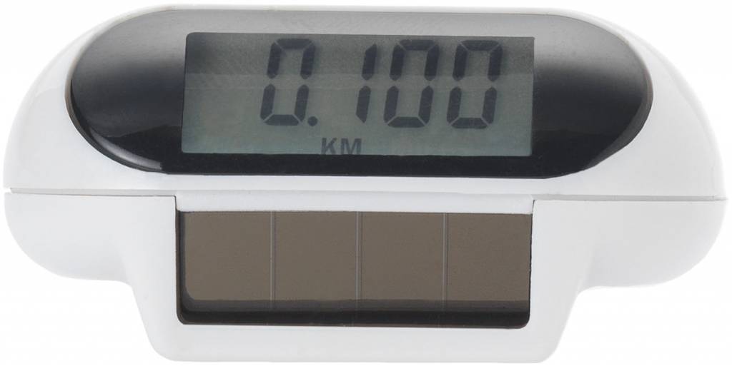Stappenteller op zonne-energie. Stappenteller op zonne-energie telt de genomen stappen (1-9.999), afgelegde afstand (KM) en het aantal verbrande calorieën. LCD-scherm en riemclip bevestigd. Auto-off energiebesparende functie. Incl. batterij. Kunststo...
